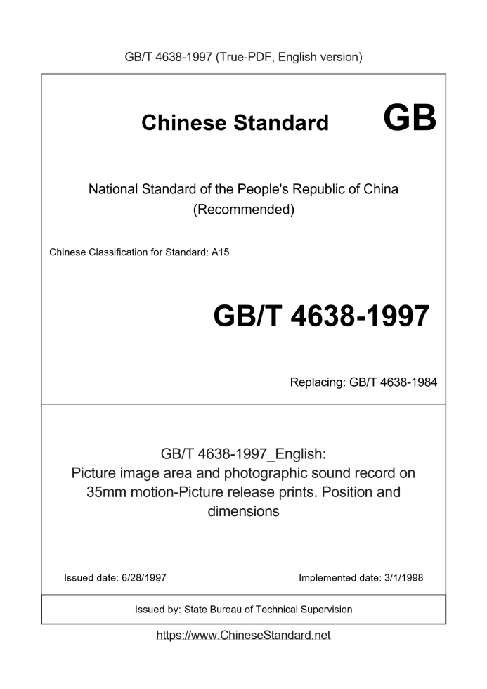 Delivery: <= 2 days. True-PDF full-copy in English will be manually translated and delivered via email. GB/T 4638-1997: Picture image area and photographic sound record on 35mm motion-Picture release prints. Position and dimensions GB/T 4638: Historical versions