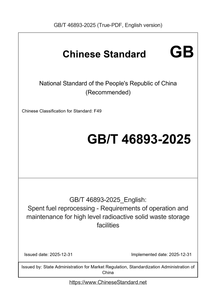 GB/T 46893-2025: Spent fuel reprocessing - Requirements of operation and maintenance for high level radioactive solid waste storage facilities