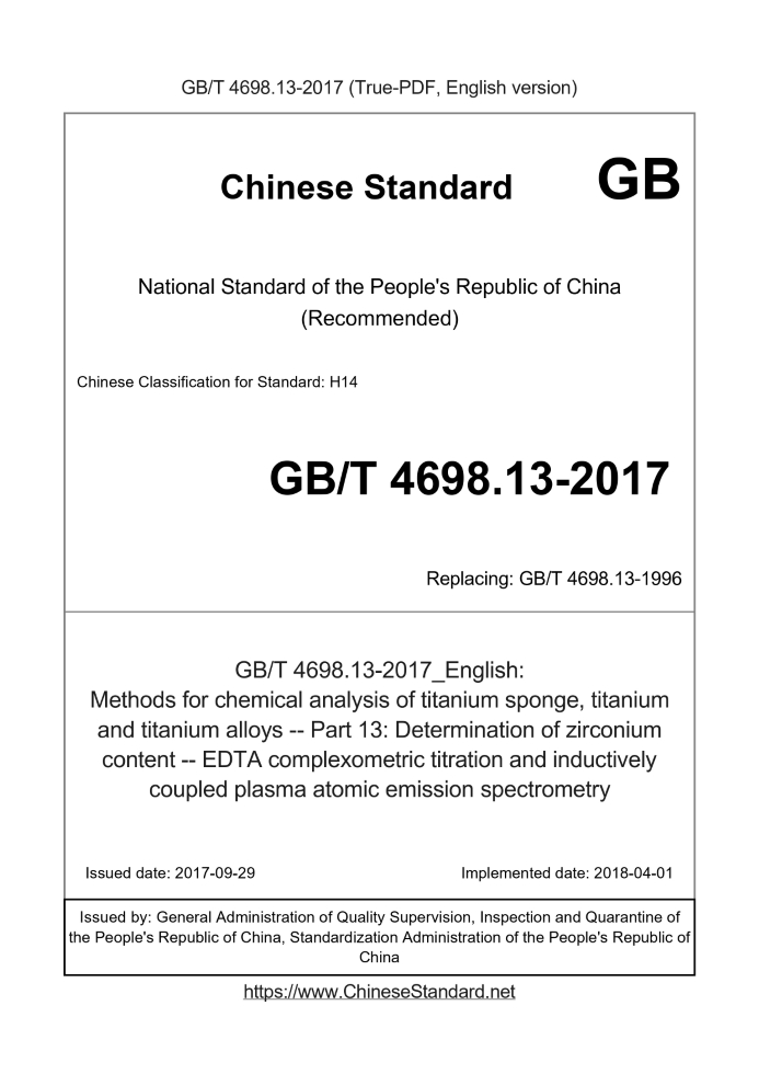 Delivery: <= 3 days. True-PDF full-copy in English will be manually translated and delivered via email. GB/T 4698.13-2017: Methods for chemical analysis of titanium sponge, titanium and titanium alloys -- Part 13: Determination of zirconium content -- EDTA complexometric titration and inductively coupled plasma atomic emission spectrometry Status: Valid GB/T 4698.13: Historical versions
