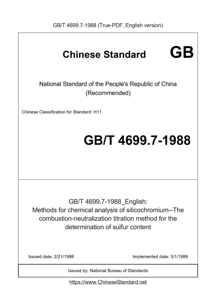 Delivery: <= 2 days. True-PDF full-copy in English will be manually translated and delivered via email. GB/T 4699.7-1988: Methods for chemical analysis of silicochromium--The combustion-neutralization titration method for the determination of sulfur content Status: Obsolete