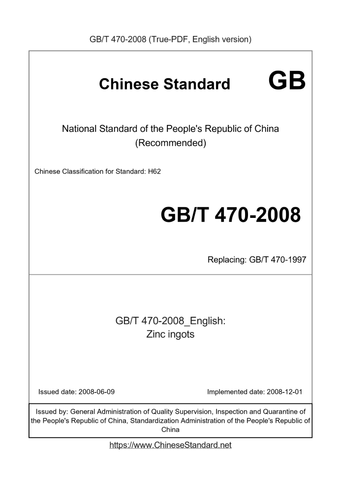 Delivery: <= 3 days. True-PDF full-copy in English will be manually translated and delivered via email. GB/T 470-2008: Zinc ingots Status: Valid GB/T 470: Historical versions