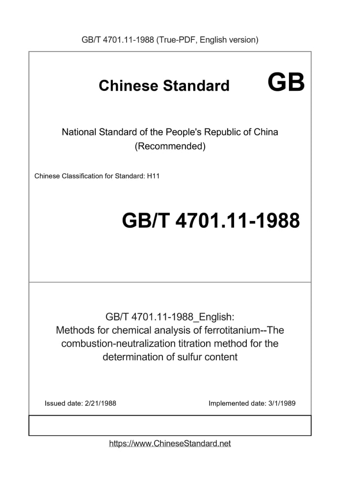 Delivery: <= 2 days. True-PDF full-copy in English will be manually translated and delivered via email. GB/T 4701.11-1988: Methods for chemical analysis of ferrotitanium--The combustion-neutralization titration method for the determination of sulfur content Status: Obsolete