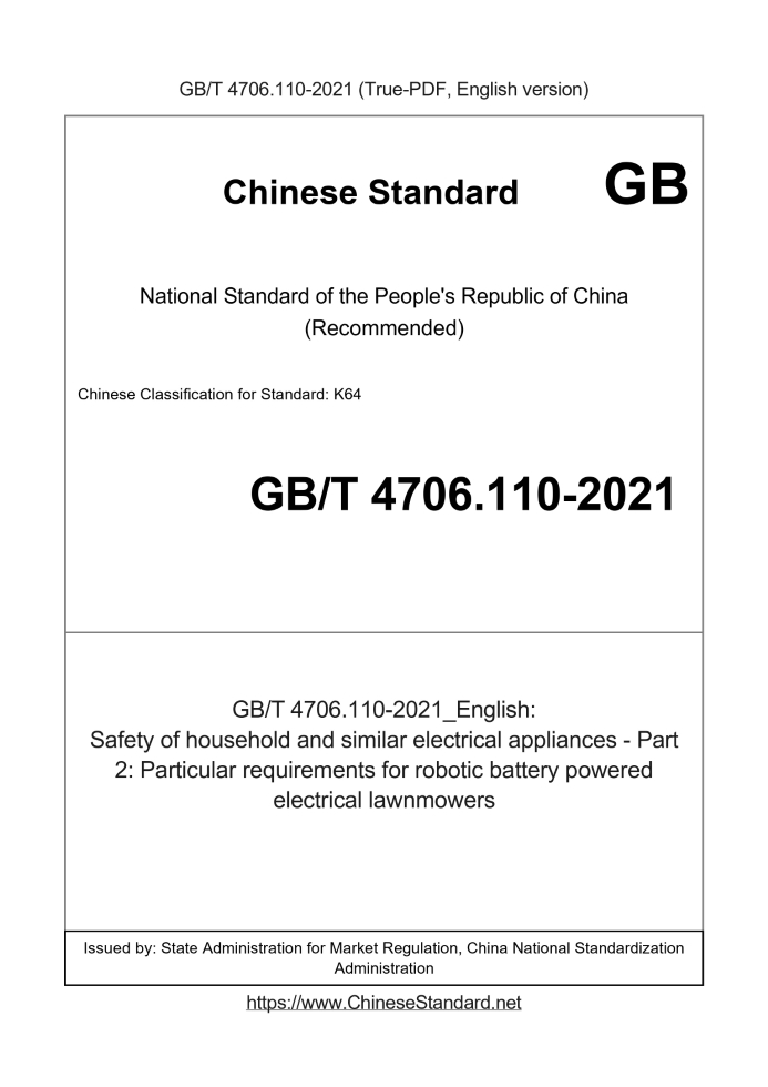 Delivery: <= 9 days. True-PDF full-copy in English will be manually translated and delivered via email. GB/T 4706.110-2021: Safety of household and similar electrical appliances - Part 2: Particular requirements for robotic battery powered electrical lawnmowers Status: Valid