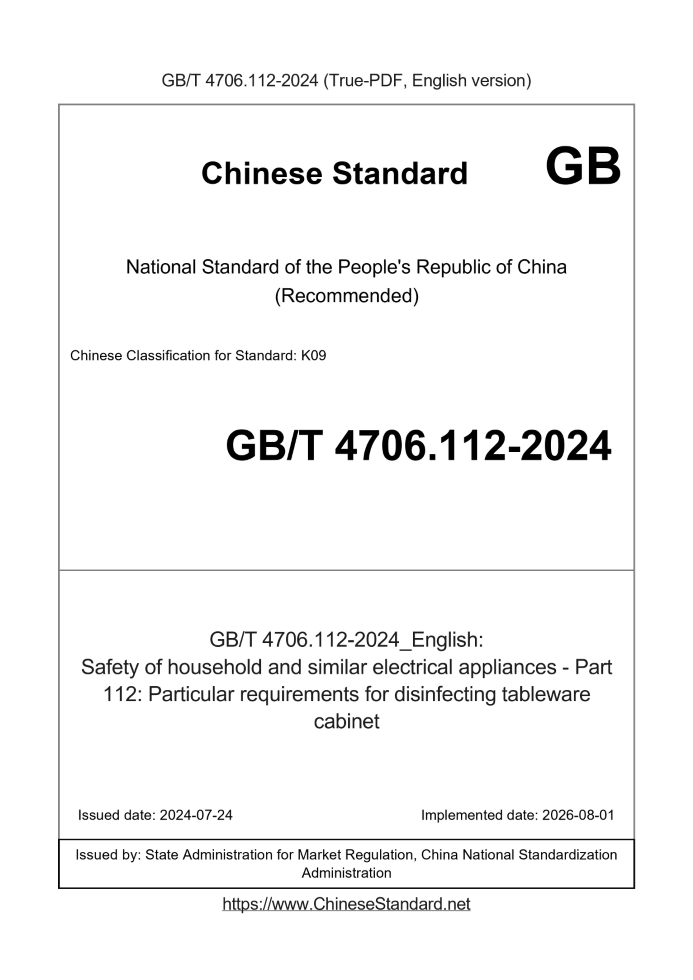 Delivery: <= 4 days. True-PDF full-copy in English will be manually translated and delivered via email. GB/T 4706.112-2024: Safety of household and similar electrical appliances - Part 112: Particular requirements for disinfecting tableware cabinet Status: Valid