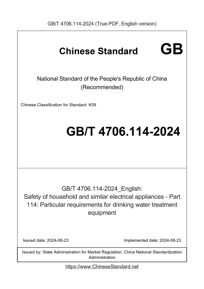 Delivery: <= 4 days. True-PDF full-copy in English will be manually translated and delivered via email. GB/T 4706.114-2024: Safety of household and similar electrical appliances - Part 114: Particular requirements for drinking water treatment equipment Status: Valid