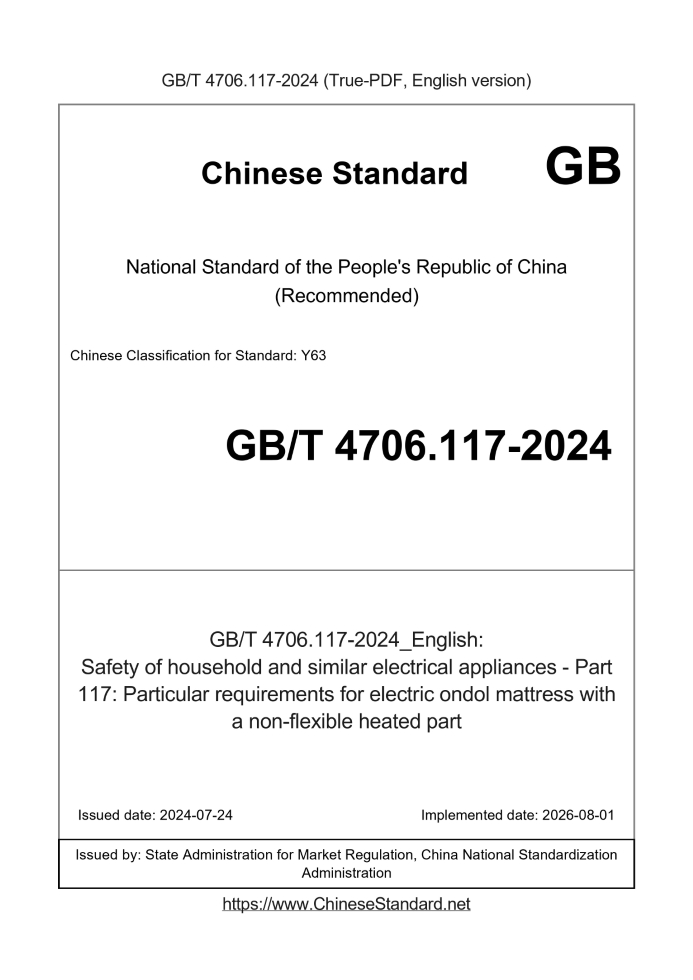 Delivery: <= 3 days. True-PDF full-copy in English will be manually translated and delivered via email. GB/T 4706.117-2024: Safety of household and similar electrical appliances - Part 117: Particular requirements for electric ondol mattress with a non-flexible heated part Status: Valid
