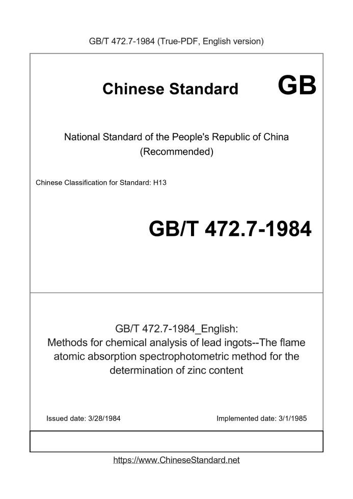 Description (Translated English): Methods for chemical analysis of lead ingots--The flame atomic absorption spectrophotometric method for the determination of zinc content