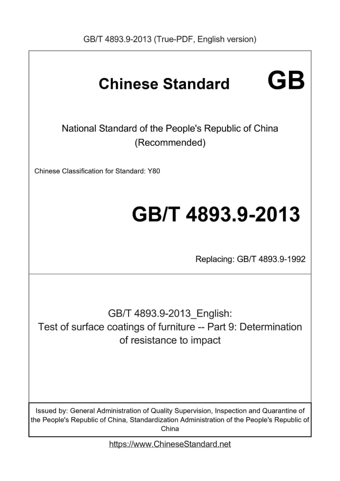 | GB/T 4893.9-2013 English PDFUS$189.00 · In stock Delivery: <= 3 days. True-PDF full-copy in English will be manually translated and delivered via email. GB/T 4893.9-2013: Test of surface coatings of furniture -- Part 9: Determination of resistance to impact Status: Valid GB/T 4893.9: Historical versions