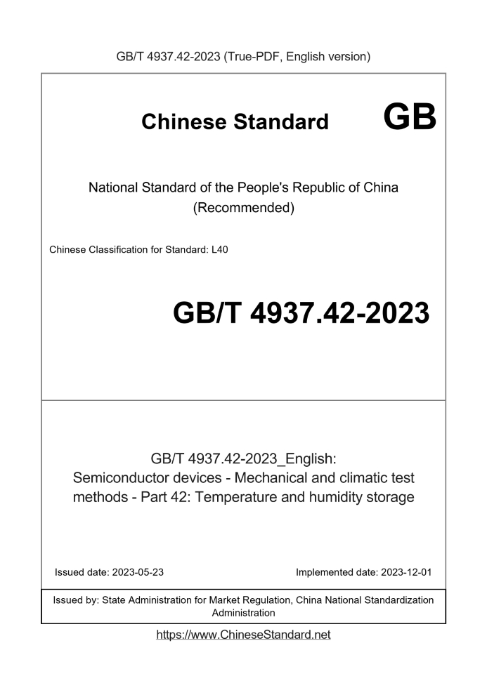 Delivery: <= 3 days. True-PDF full-copy in English will be manually translated and delivered via email. GB/T 4937.42-2023: Semiconductor devices - Mechanical and climatic test methods - Part 42: Temperature and humidity storage Status: Valid