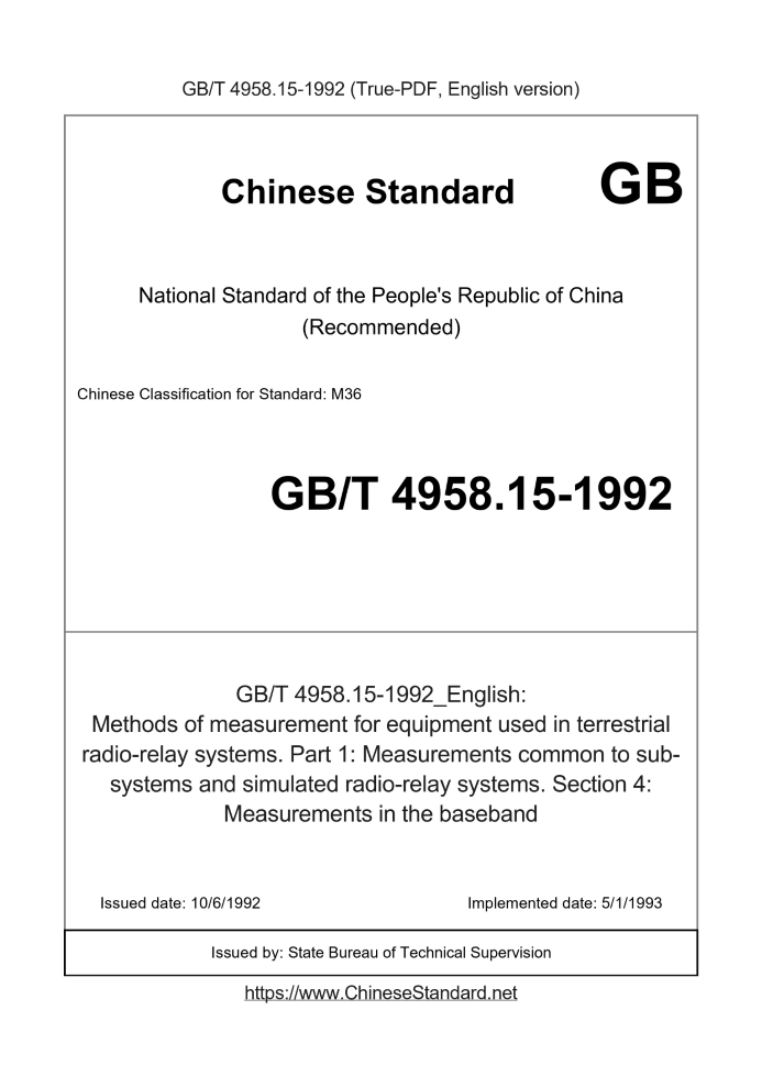 GB/T 4958.15-1992: Methods of measurement for equipment used in terrestrial radio-relay systems. Part 1: Measurements common to sub-systems and simulated radio-relay systems. Section 4: Measurements in the baseband