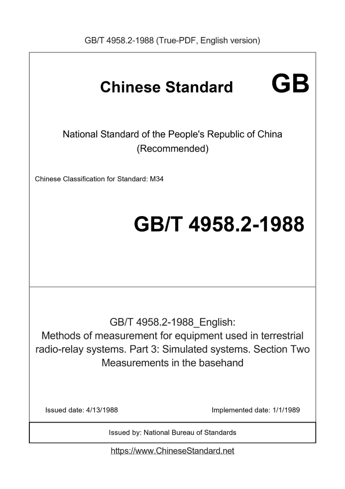 Delivery: <= 3 days. True-PDF full-copy in English will be manually translated and delivered via email. GB/T 4958.2-1988: Methods of measurement for equipment used in terrestrial radio-relay systems. Part 3: Simulated systems. Section Two Measurements in the basehand Status: Obsolete