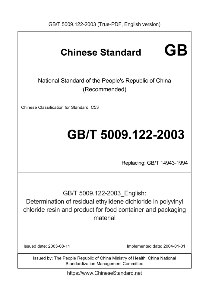 | GB/T 5009.122-2003 English PDFUS$199.00 ยท In stock Delivery: <= 2 days. True-PDF full-copy in English will be manually translated and delivered via email. GB/T 5009.122-2003: Determination of residual ethylidene dichloride in polyvinyl chloride resin and product for food container and packaging material Status: Obsolete