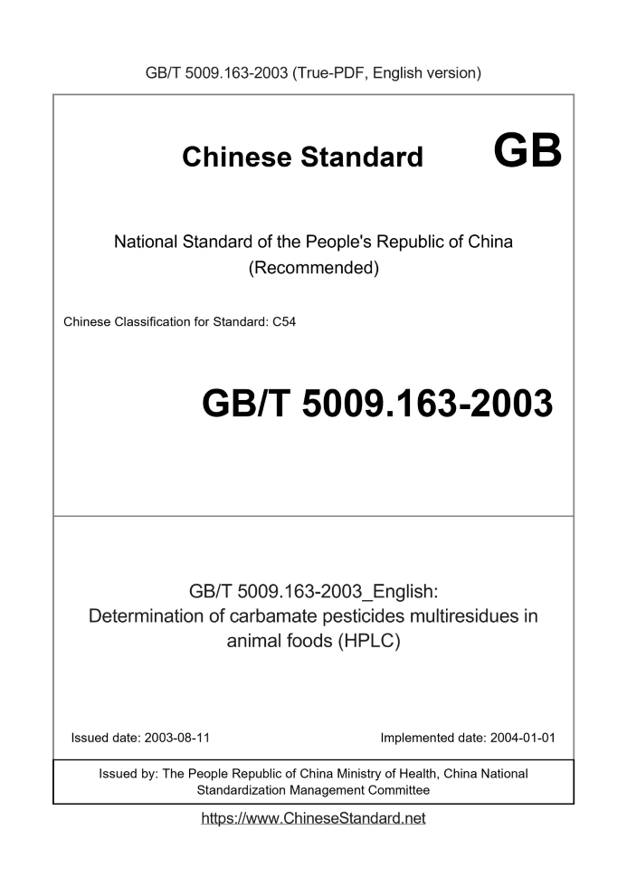 Delivery: <= 3 days. True-PDF full-copy in English will be manually translated and delivered via email. GB/T 5009.163-2003: Determination of carbamate pesticides multiresidues in animal foods (HPLC) Status: Valid