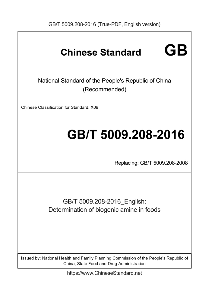 Delivery: <= 3 days. True-PDF full-copy in English will be manually translated and delivered via email. GB/T 5009.208-2016: Determination of biogenic amine in foods GB/T 5009.208: Historical versions