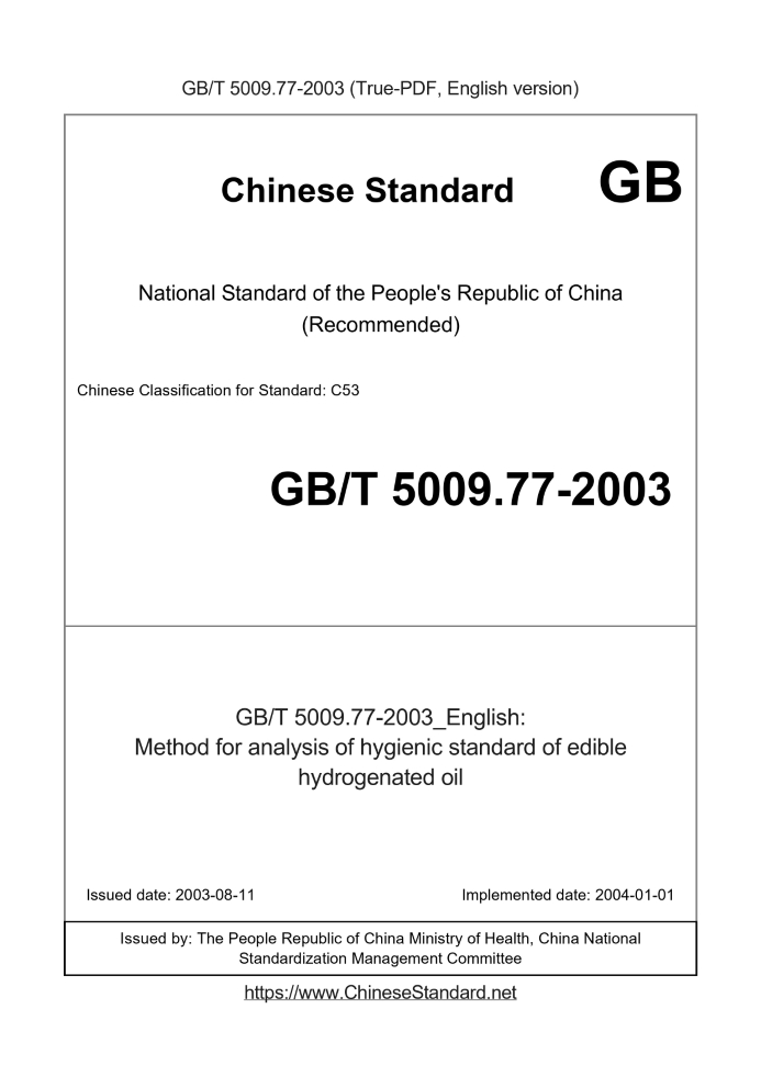 GB/T 5009.77-2003239 Add to Cart 3 days Method for analysis of hygienic standard of edible hydrogenated oil Valid