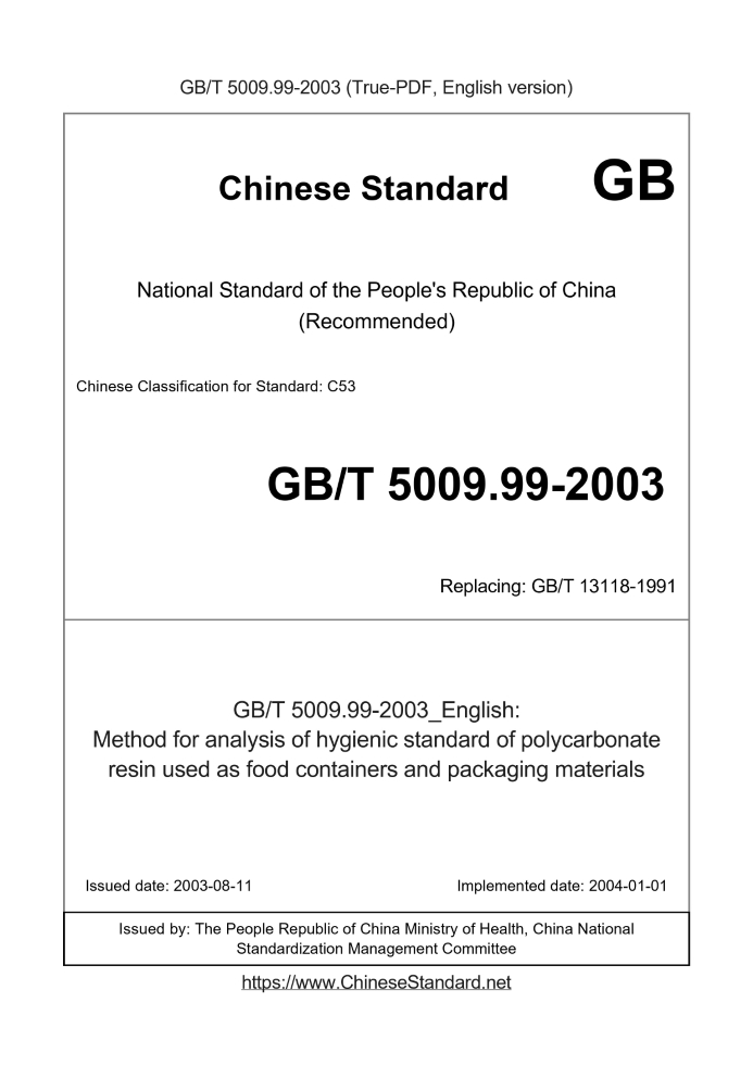 Delivery: <= 2 days. True-PDF full-copy in English will be manually translated and delivered via email. GB/T 5009.99-2003: Method for analysis of hygienic standard of polycarbonate resin used as food containers and packaging materials Status: Obsolete