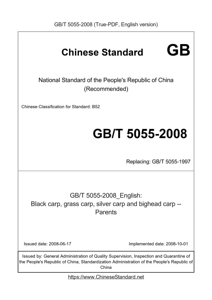 Delivery: <= 3 days. True-PDF full-copy in English will be manually translated and delivered via email. GB/T 5055-2008: Black carp, grass carp, silver carp and bighead carp -- Parents Status: Valid GB/T 5055: Historical versions