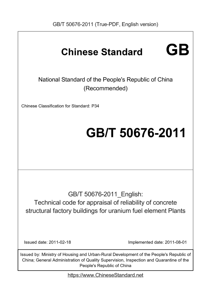 Delivery: <= 10 days. True-PDF full-copy in English will be manually translated and delivered via email. GB/T 50676-2011: Technical code for appraisal of reliability of concrete structural factory buildings for uranium fuel element Plants Status: Valid