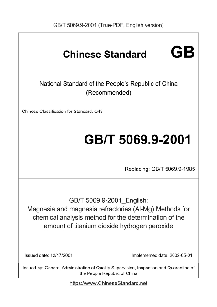 Delivery: <= 2 days. True-PDF full-copy in English will be manually translated and delivered via email. GB/T 5069.9-2001: Magnesia and magnesia refractories (Al-Mg) Methods for chemical analysis method for the determination of the amount of titanium dioxide hydrogen peroxide Status: Obsolete GB/T 5069.9: Historical versions