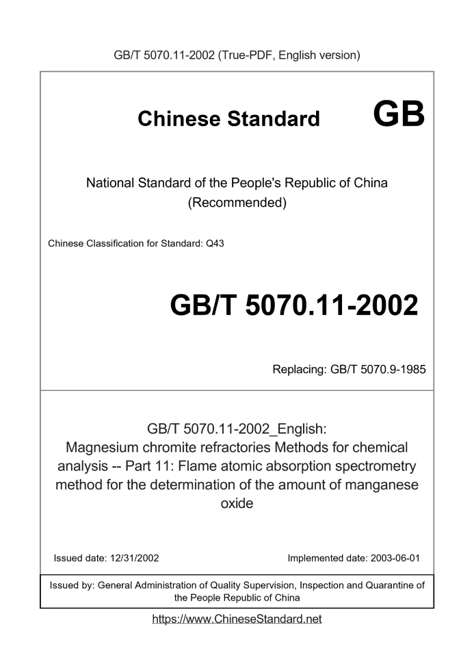 Delivery: <= 2 days. True-PDF full-copy in English will be manually translated and delivered via email. GB/T 5070.11-2002: Magnesium chromite refractories Methods for chemical analysis -- Part 11: Flame atomic absorption spectrometry method for the determination of the amount of manganese oxide Status: Obsolete