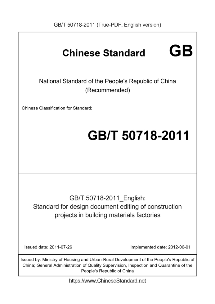 Delivery: <= 13 days. True-PDF full-copy in English will be manually translated and delivered via email. GB/T 50718-2011: Standard for design document editing of construction projects in building materials factories Status: Valid