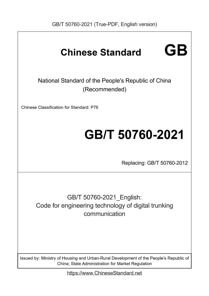Delivery: <= 8 days. True-PDF full-copy in English will be manually translated and delivered via email. GB/T 50760-2021: Code for engineering technology of digital trunking communication Status: Valid GB/T 50760: Historical versions