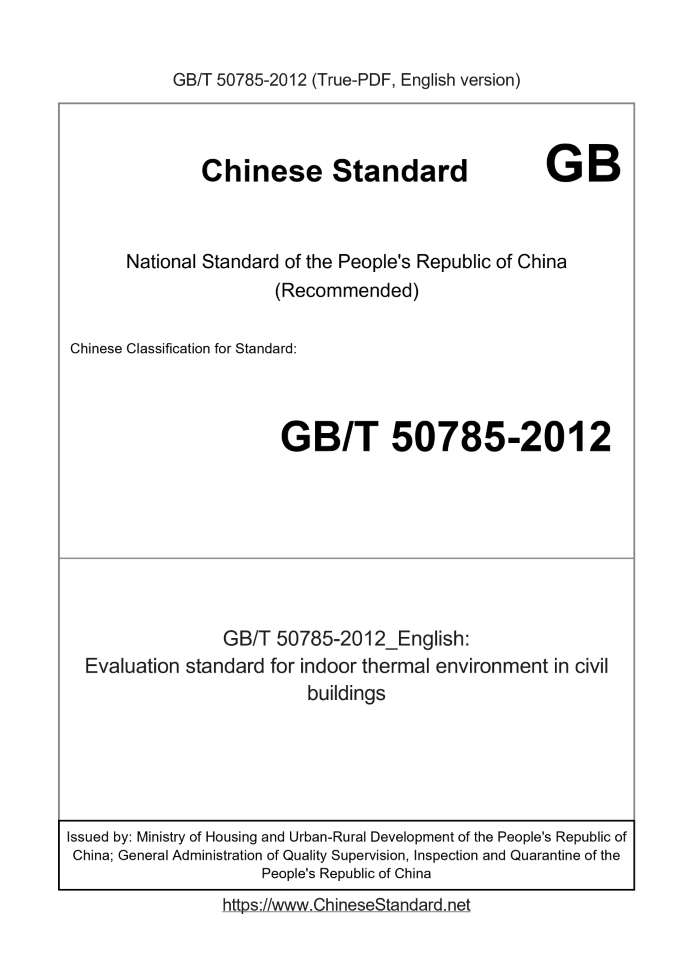 Delivery: <= 10 days. True-PDF full-copy in English will be manually translated and delivered via email. GB/T 50785-2012: Evaluation standard for indoor thermal environment in civil buildings Status: Valid