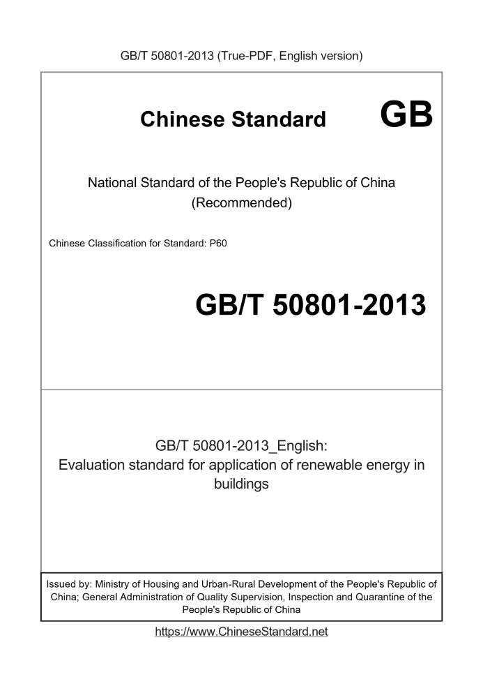 Delivery: <= 13 days. True-PDF full-copy in English will be manually translated and delivered via email. GB/T 50801-2013: Evaluation standard for application of renewable energy in buildings Status: Valid