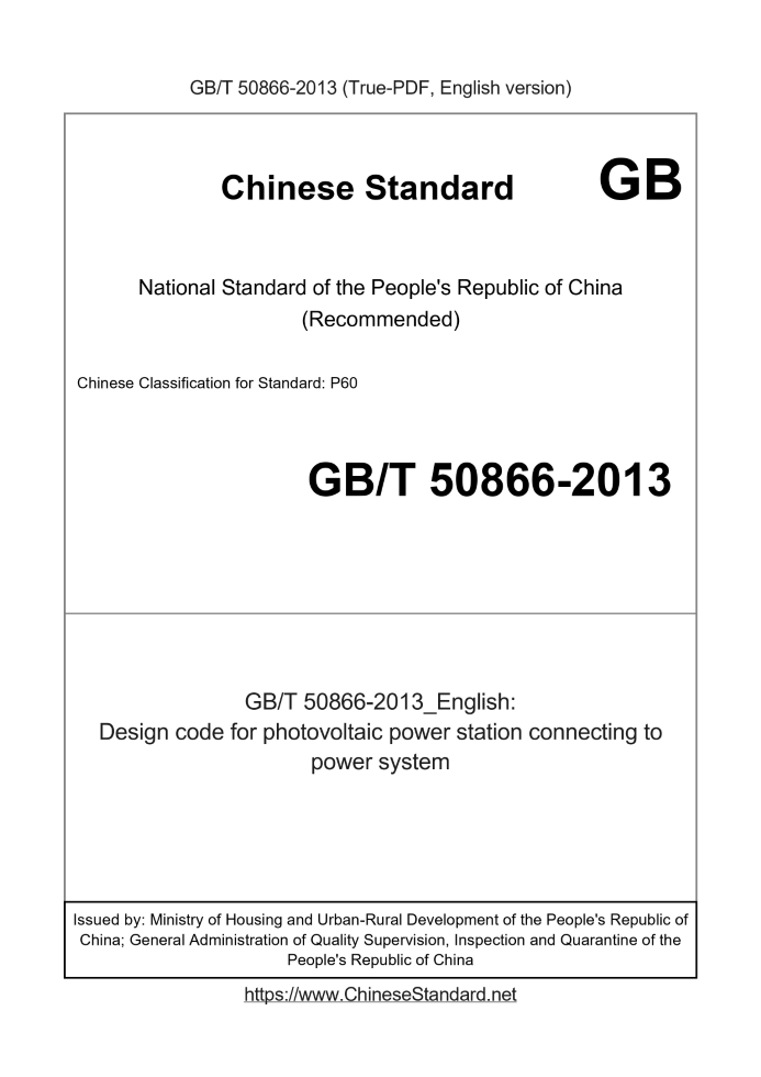 Delivery: <= 7 days. True-PDF full-copy in English will be manually translated and delivered via email. GB/T 50866-2013: Design code for photovoltaic power station connecting to power system Status: Valid