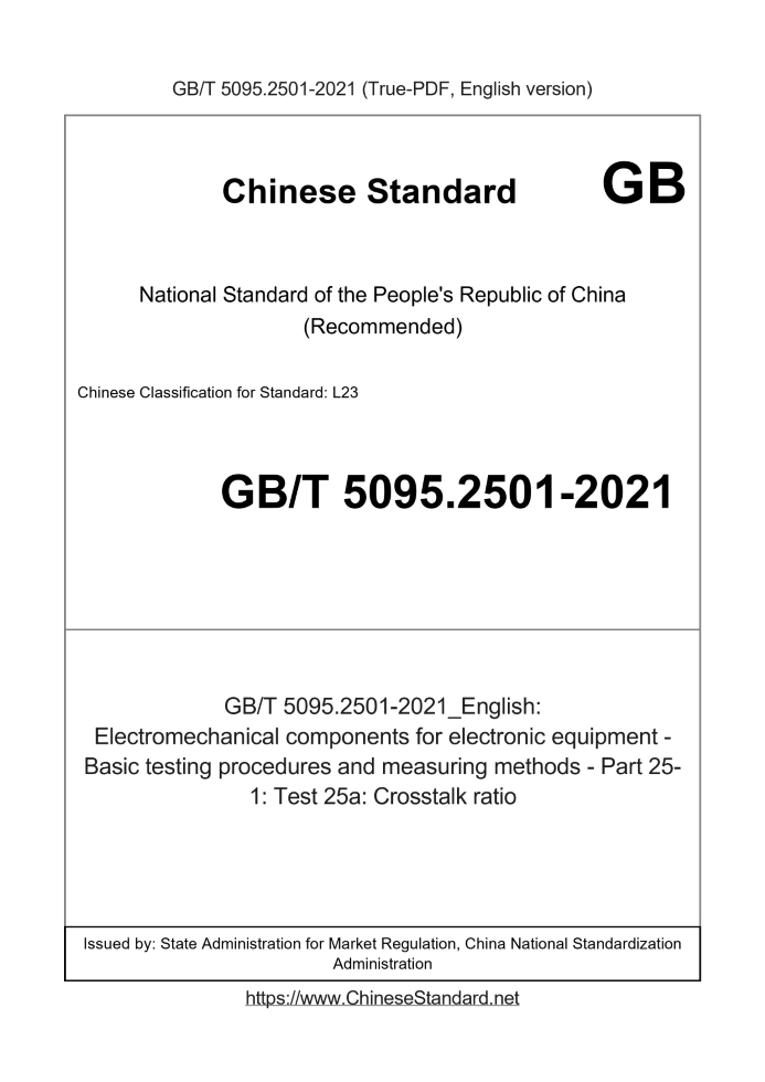 Delivery: <= 3 days. True-PDF full-copy in English will be manually translated and delivered via email. GB/T 5095.2501-2021: Electromechanical components for electronic equipment - Basic testing procedures and measuring methods - Part 25-1: Test 25a: Crosstalk ratio Status: Valid
