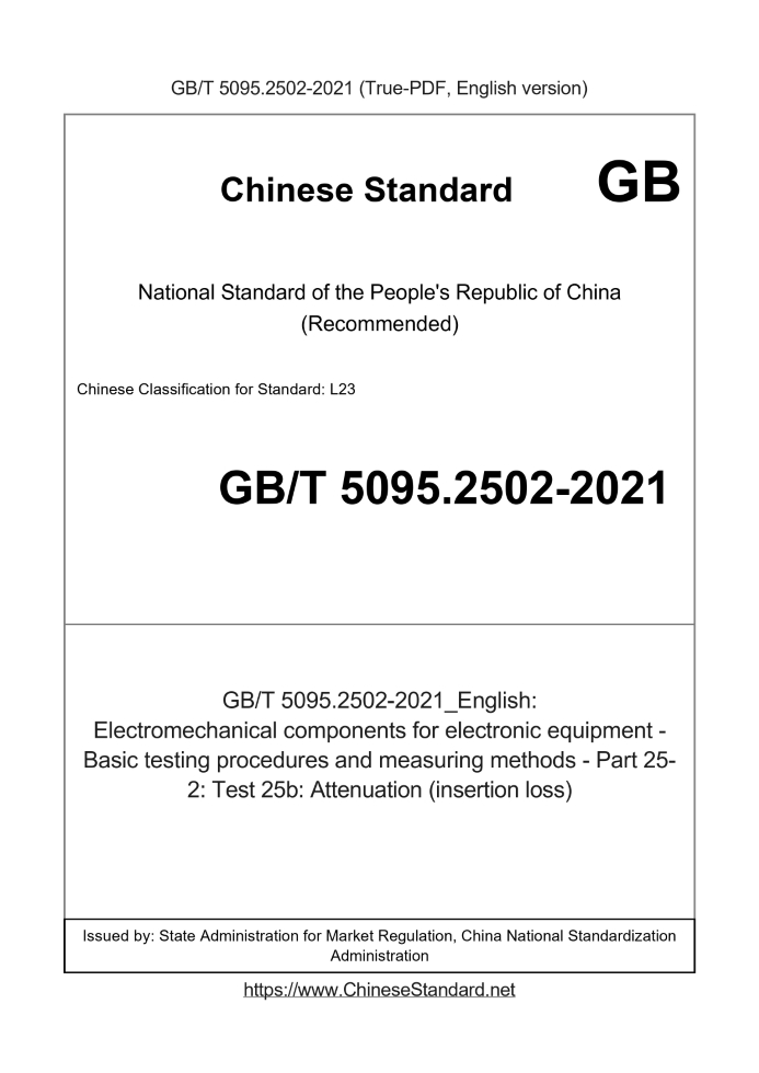 Delivery: <= 3 days. True-PDF full-copy in English will be manually translated and delivered via email. GB/T 5095.2502-2021: Electromechanical components for electronic equipment - Basic testing procedures and measuring methods - Part 25-2: Test 25b: Attenuation (insertion loss) Status: Valid