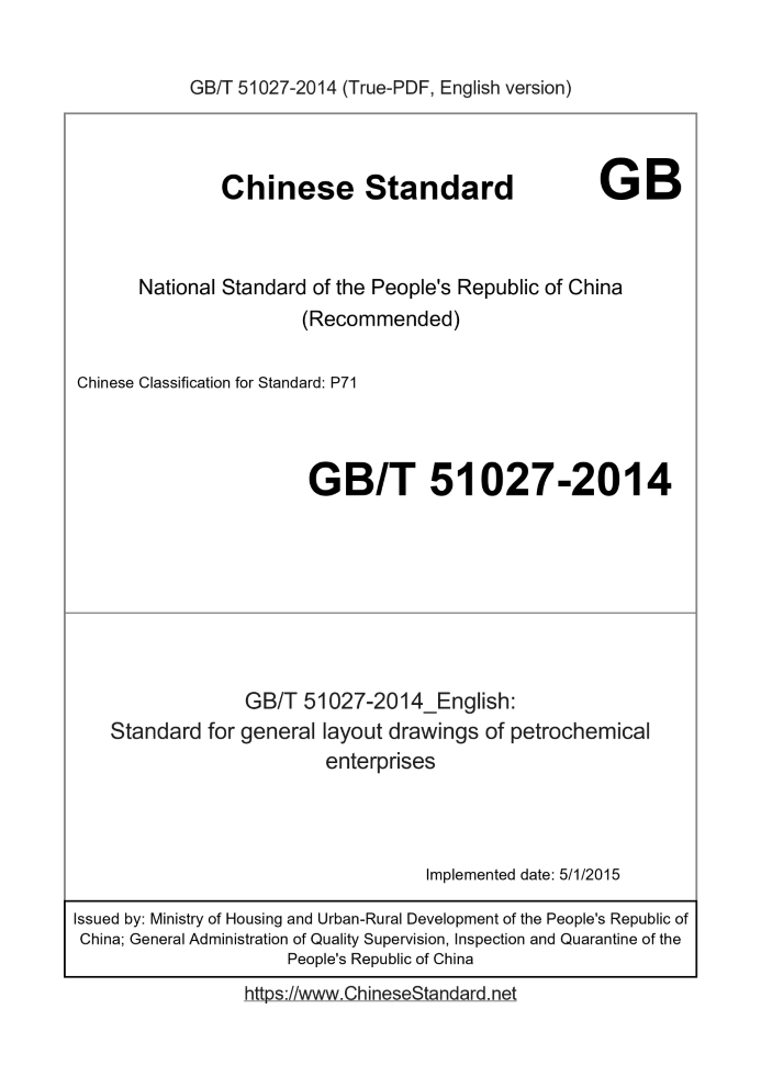 Delivery: <= 7 days. True-PDF full-copy in English will be manually translated and delivered via email. GB/T 51027-2014: Standard for general layout drawings of petrochemical enterprises Status: Valid