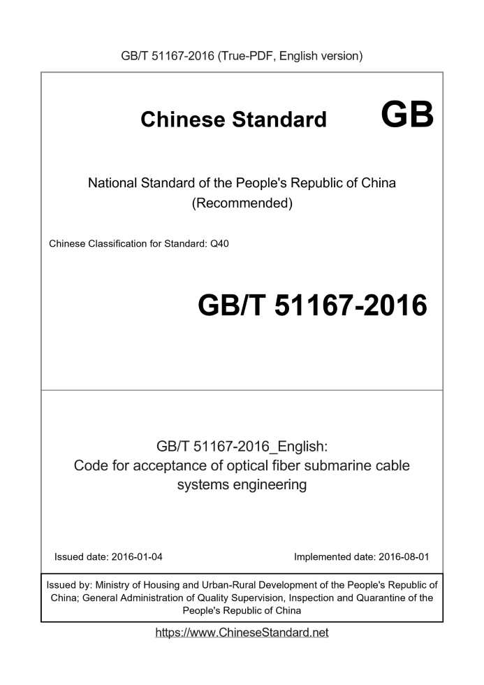 GB/T 51167-2016: Code for acceptance of optical fiber submarine cable systems engineering