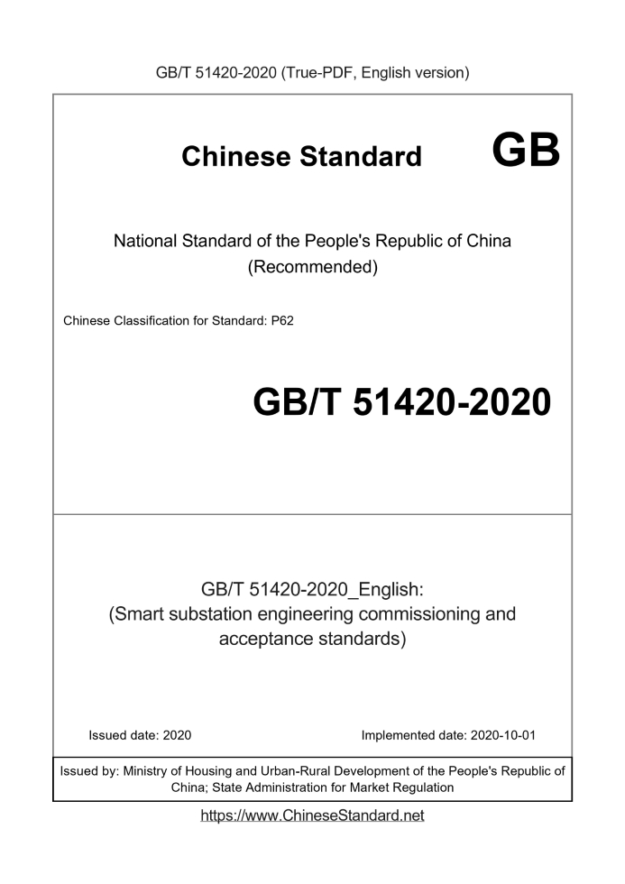 Delivery: <= 8 days. True-PDF full-copy in English will be manually translated and delivered via email. GB/T 51420-2020: (Smart substation engineering commissioning and acceptance standards) Status: Valid