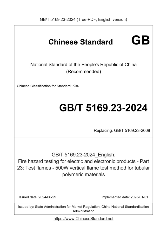 Delivery: <= 4 days. True-PDF full-copy in English will be manually translated and delivered via email. GB/T 5169.23-2024: Fire hazard testing for electric and electronic products - Part 23: Test flames - 500W vertical flame test method for tubular polymeric materials Status: Valid GB/T 5169.23: Historical versions