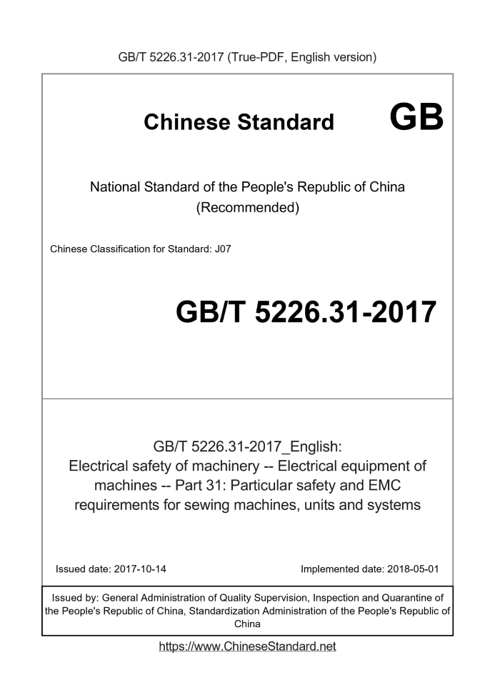 Delivery: <= 3 days. True-PDF full-copy in English will be manually translated and delivered via email. GB/T 5226.31-2017: Electrical safety of machinery -- Electrical equipment of machines -- Part 31: Particular safety and EMC requirements for sewing machines, units and systems Status: Valid