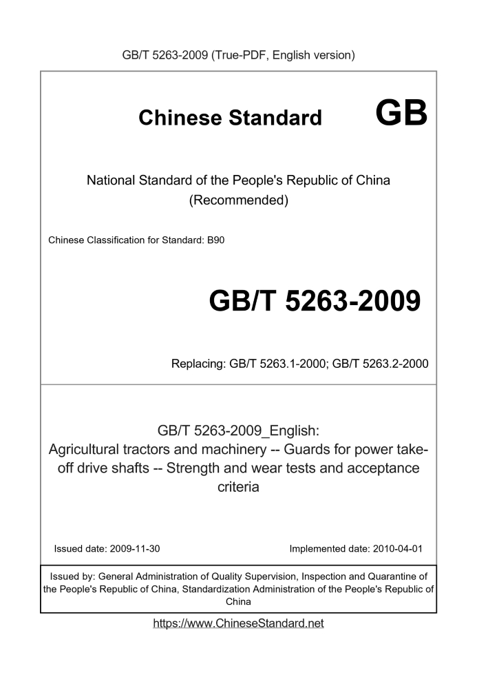 Delivery: <= 4 days. True-PDF full-copy in English will be manually translated and delivered via email. GB/T 5263-2009: Agricultural tractors and machinery -- Guards for power take-off drive shafts -- Strength and wear tests and acceptance criteria Status: Valid GB/T 5263: Historical versions