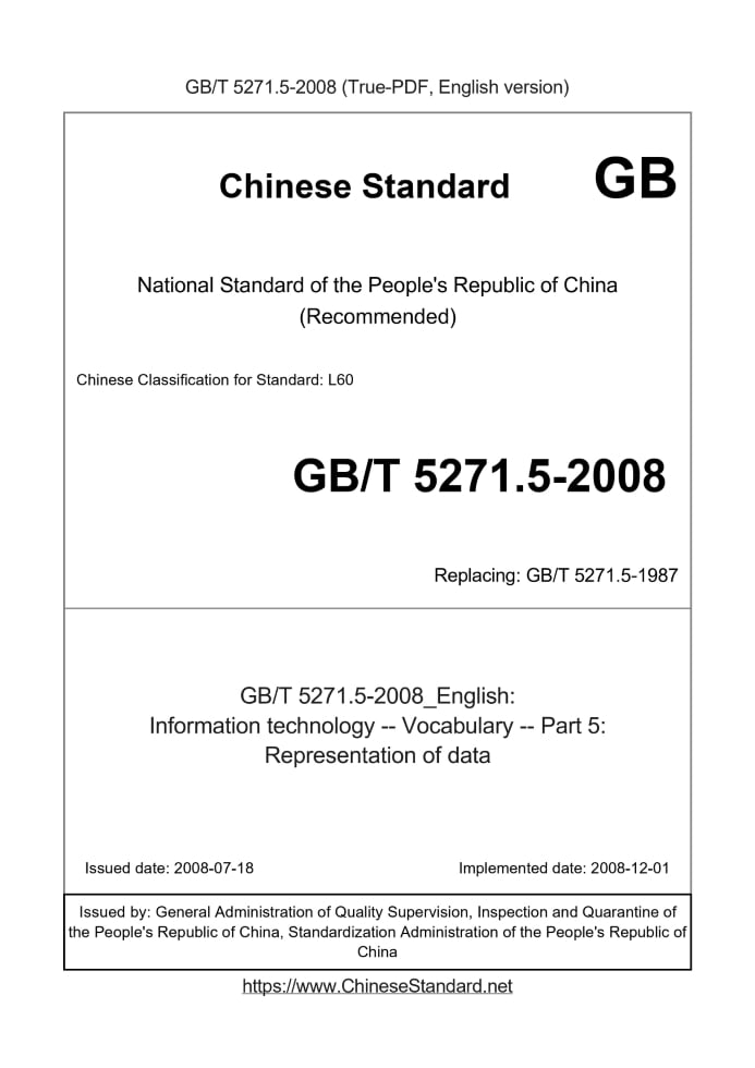 Delivery: <= 4 days. True-PDF full-copy in English will be manually translated and delivered via email. GB/T 5271.5-2008: Information technology -- Vocabulary -- Part 5: Representation of data Status: Valid GB/T 5271.5: Historical versions