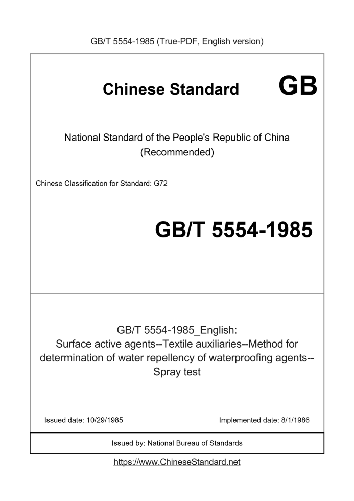 Delivery: <= 2 days. True-PDF full-copy in English will be manually translated and delivered via email. GB/T 5554-1985: Surface active agents--Textile auxiliaries--Method for determination of water repellency of waterproofing agents--Spray test Status: Obsolete