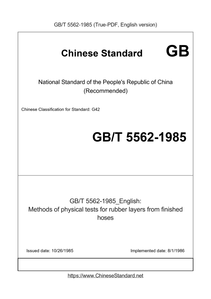 Delivery: <= 3 days. True-PDF full-copy in English will be manually translated and delivered via email. GB/T 5562-1985: Methods of physical tests for rubber layers from finished hoses Status: Obsolete