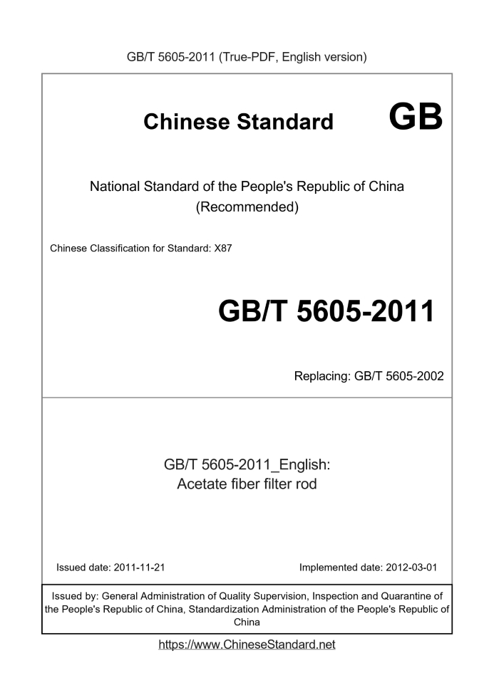 Delivery: <= 3 days. True-PDF full-copy in English will be manually translated and delivered via email. GB/T 5605-2011: Acetate fiber filter rod Status: Valid GB/T 5605: Historical versions