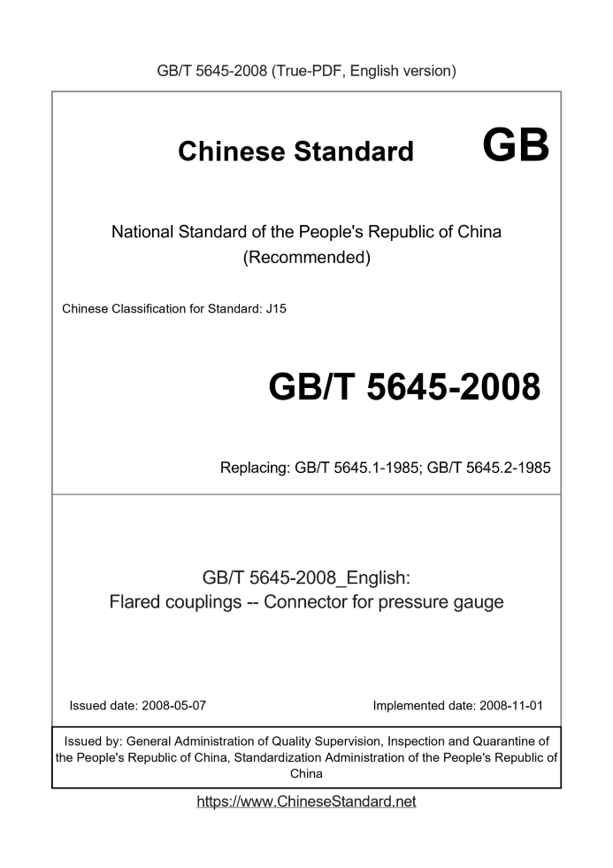 Delivery: <= 2 days. True-PDF full-copy in English will be manually translated and delivered via email. GB/T 5645-2008: Flared couplings -- Connector for pressure gauge Status: Valid GB/T 5645: Historical versions