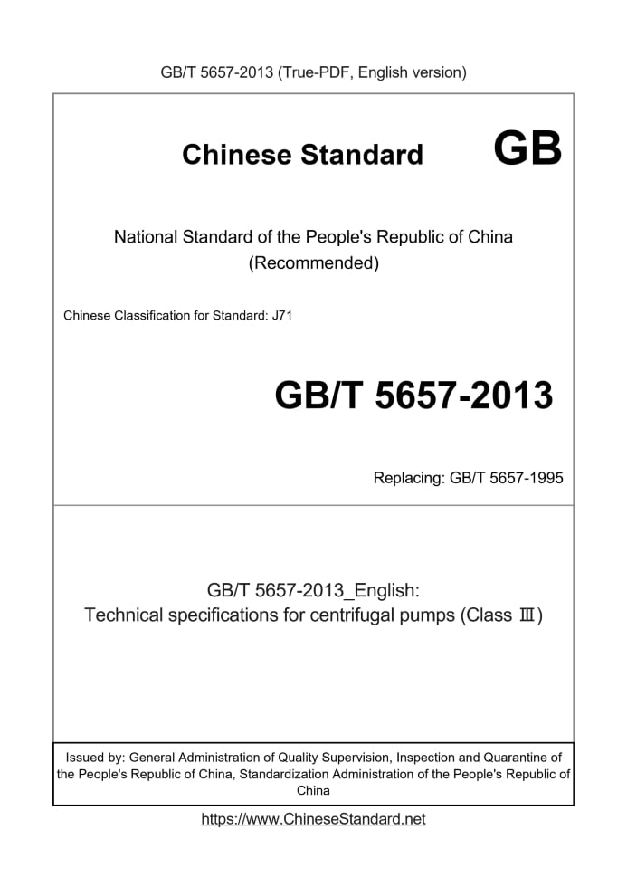 Delivery: <= 5 days. True-PDF full-copy in English will be manually translated and delivered via email. GB/T 5657-2013: Technical specifications for centrifugal pumps (Class Ⅲ) Status: Valid GB/T 5657: Historical versions