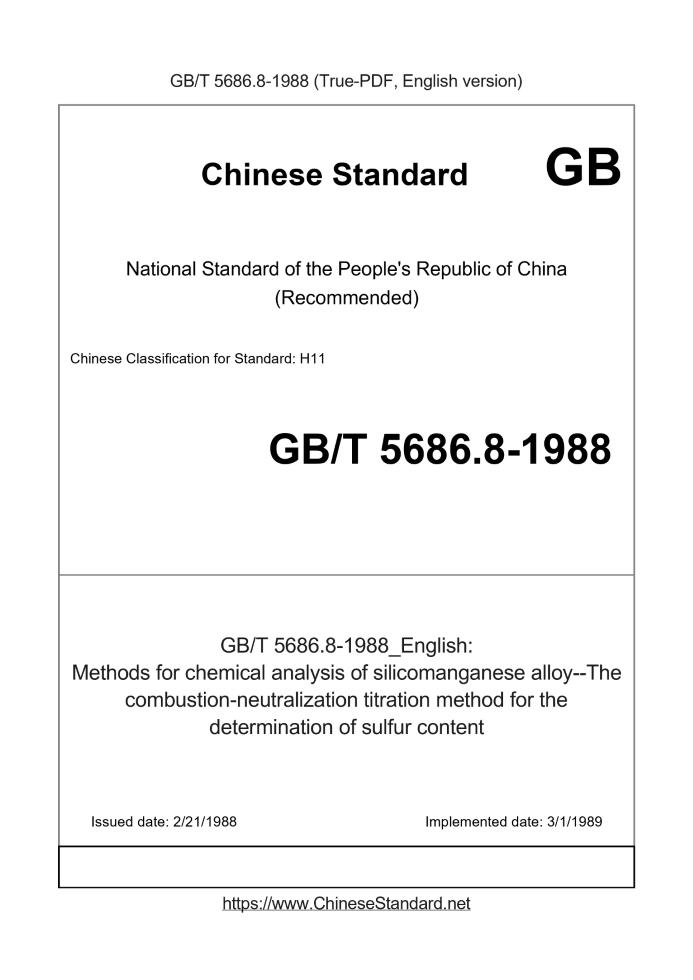 Delivery: <= 2 days. True-PDF full-copy in English will be manually translated and delivered via email. GB/T 5686.8-1988: Methods for chemical analysis of silicomanganese alloy--The combustion-neutralization titration method for the determination of sulfur content Status: Obsolete