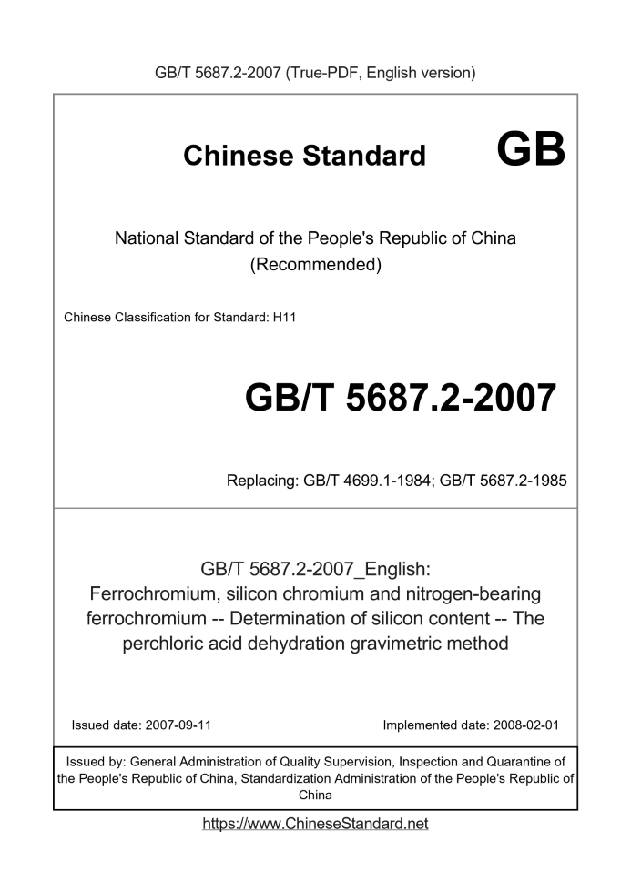 Ferrochromium, silicochromium and nitrogen-bearing ferrochromium. Determination of silicon content. The perchloric acid dehydration gravimetric method ICS 77.100 H11 National Standards of People's Republic of China Replacing GB/T 4699.1-1984, GB/T 5687.2-1985 Determination of chromium iron, chrome and silicon nitride ferrochrome silicon content Perchloric acid dehydration gravimetric method Posted 2007-09-11 2008-02-01 implementation Administration of Quality Supervision, Inspection and Quarantine of People's Republic of China Standardization Administration of China released