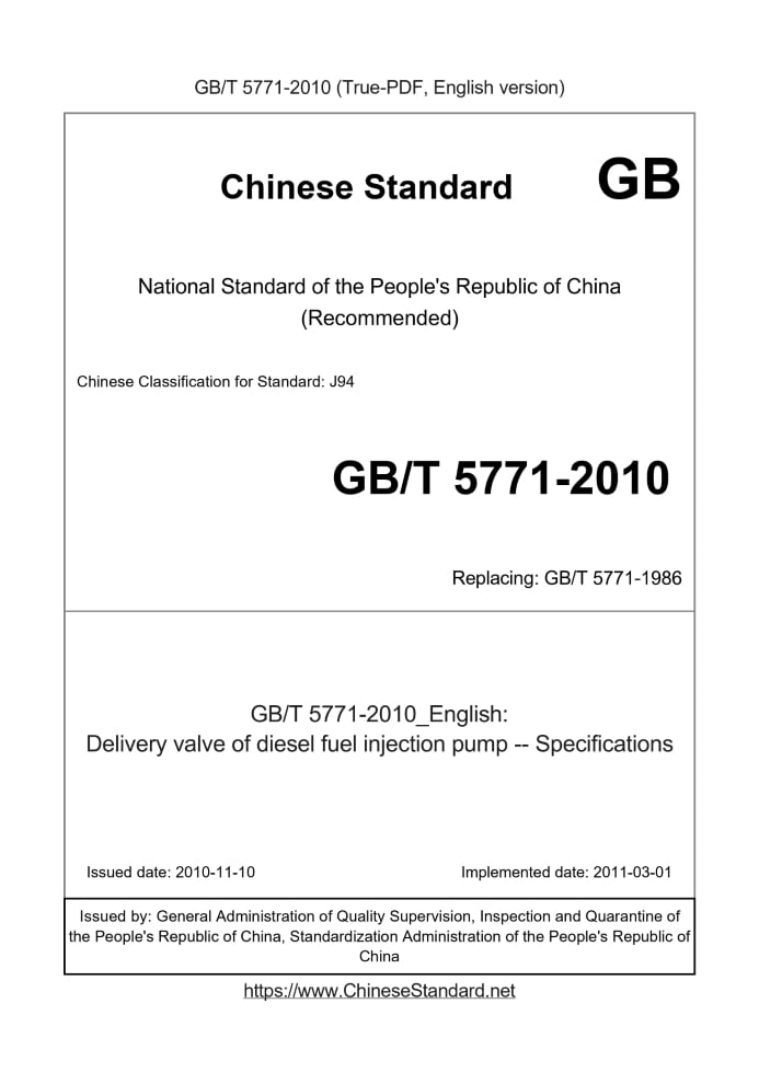 Delivery: <= 3 days. True-PDF full-copy in English will be manually translated and delivered via email. GB/T 5771-2010: Delivery valve of diesel fuel injection pump -- Specifications Status: Valid GB/T 5771: Historical versions