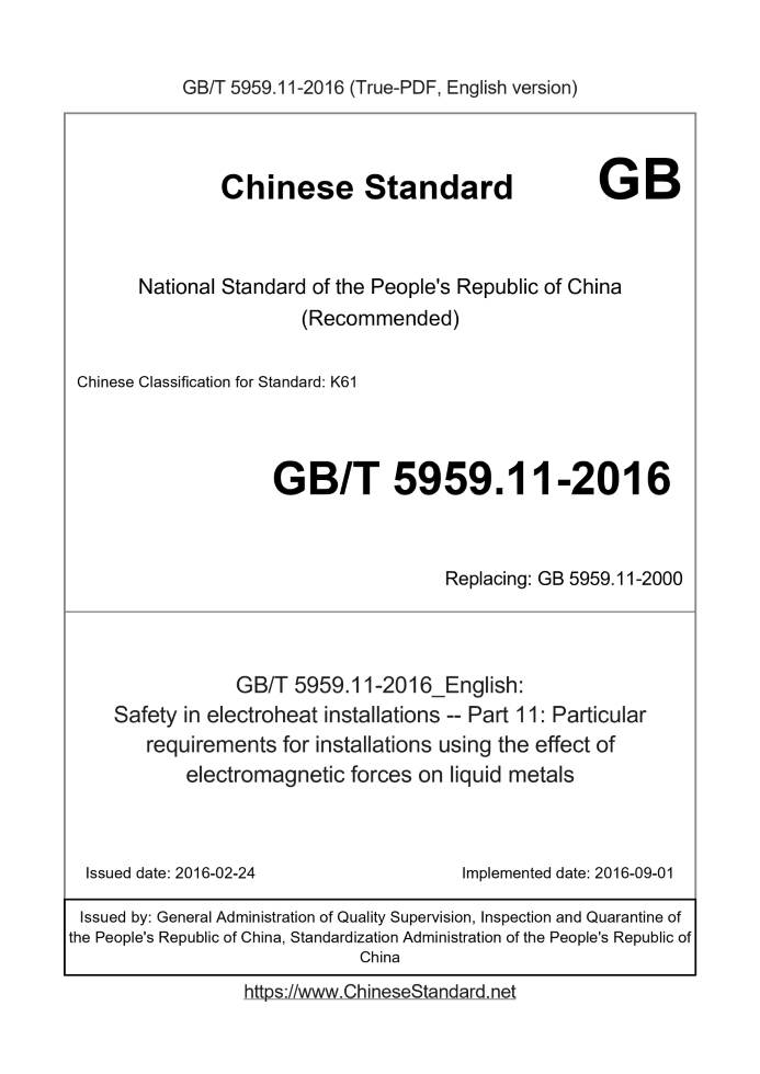 Delivery: <= 3 days. True-PDF full-copy in English will be manually translated and delivered via email. GB/T 5959.11-2016: Safety in electroheat installations -- Part 11: Particular requirements for installations using the effect of electromagnetic forces on liquid metals Status: Valid GB/T 5959.11: Historical versions