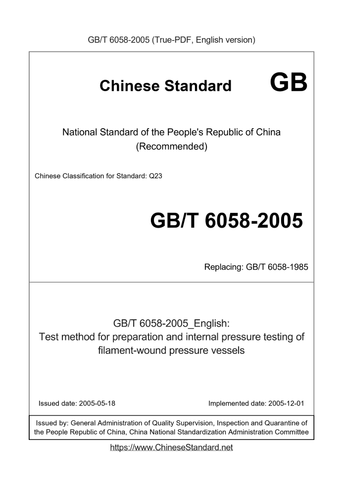 Delivery: <= 3 days. True-PDF full-copy in English will be manually translated and delivered via email. GB/T 6058-2005: Test method for preparation and internal pressure testing of filament-wound pressure vessels Status: Valid GB/T 6058: Historical versions