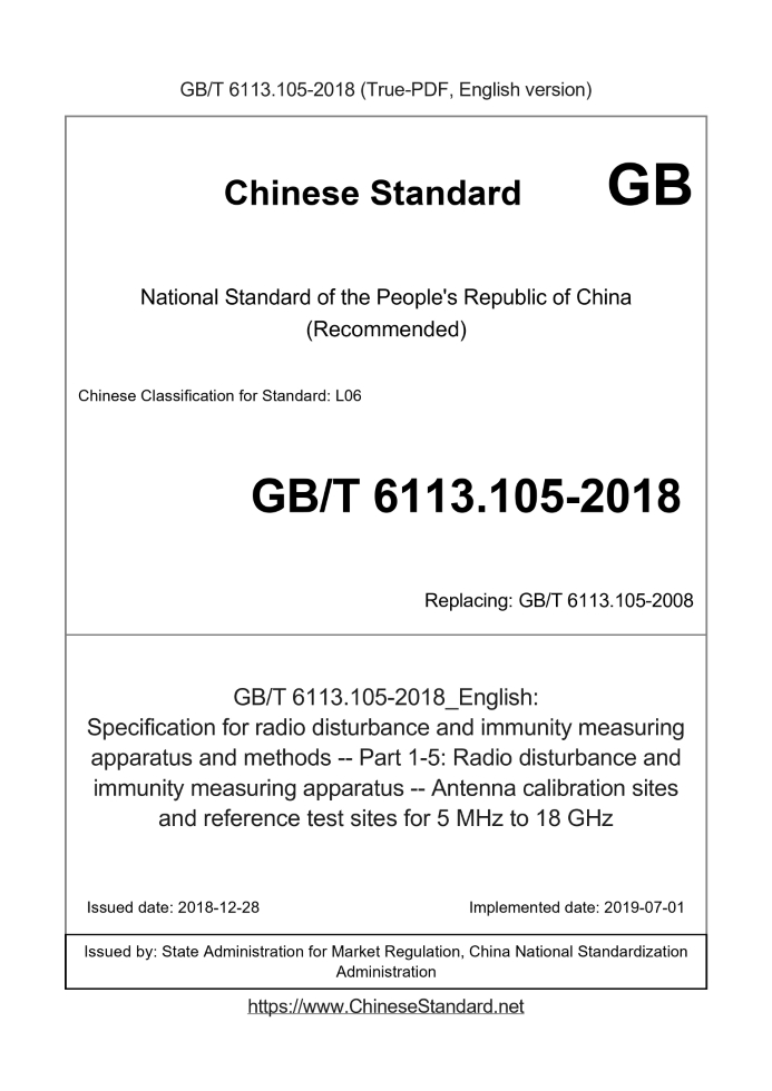 Specification for radio disturbance and immunity measuring apparatus and methods--Part 1--5. Radio disturbance and immunity measuring apparatus--Antenna calibration sites and reference test sites for 5 MHz to 18 GHz ICS 33.100 L06 National Standards of People's Republic of China Replace GB/T 6113.105-2008 Radio disturbance and immunity measuring equipment and Measurement method specification Part 1-5. Radio disturbance and immunity measuring equipment 5MHz~18GHz antenna calibration site and Reference test site Part 1-5. Radiodisturbanceandimmunitymeasuringapparatus- (CISPR16-1-5..2014, IDT) 2018-12-28 released.2019-07-01 implementation State market supervision and administration China National Standardization Administration issued