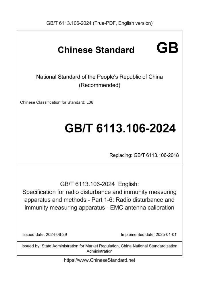 Delivery: <= 15 days. True-PDF full-copy in English will be manually translated and delivered via email. GB/T 6113.106-2024: Specification for radio disturbance and immunity measuring apparatus and methods - Part 1-6: Radio disturbance and immunity measuring apparatus - EMC antenna calibration Status: Valid GB/T 6113.106: Historical versions